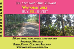 80 cents mixed agricultural land for sale at Poothadi, Wayanad. 25m tar road frontage,RUBBER,PEPPER ,COCONUT,arecanut are cultivated,electricity,public water facilities are available.Asking price:25000/cent.